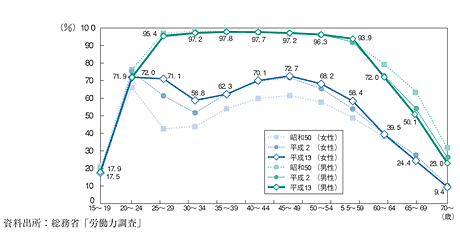 男女別の年齢階級別労働力率をみると,男性が20歳代後半から50歳代までを山とする台形を描くのに対し,女性では,30歳代前半を谷とするM字カーブを描いている。これは,昭和40年代からみられる我が国の女性労働力率の特徴である(第11図)。