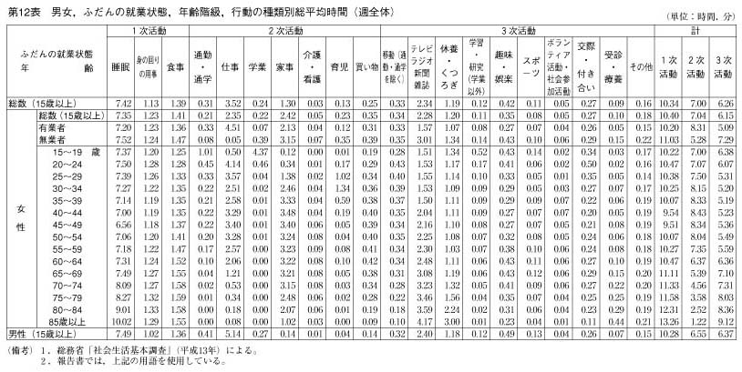 附属統計表 > 第12表 男女,ふだんの就業状態,年齢階級,行動の種類別総平均時間(週全体)