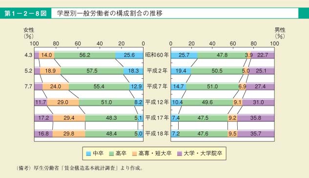 図表 > 第1部 > 第2章 > 第8図 学歴別一般労働者の構成割合の推移