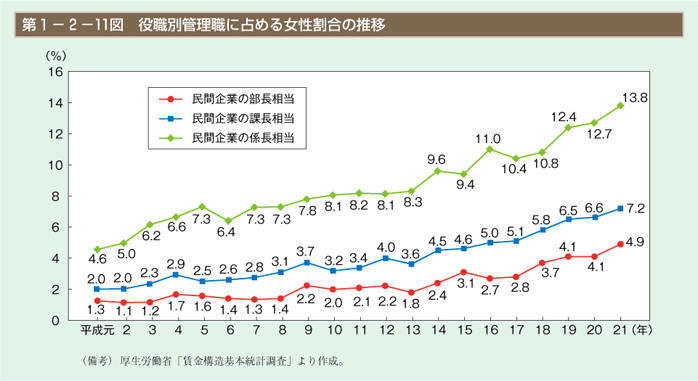 図表 > 第1部 > 第2章 > 第11図 役職別管理職に占める女性割合の推移