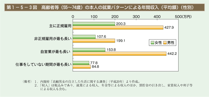図表 > 第1部 > 第5章 > 第3図 高齢者等(55~74歳)の本人の就業パターンによる年間収入(平均額)(性別)