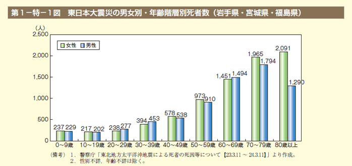 図表 > 第1部 > 特集 > 第1図 東日本大震災の男女別・年齢階層別死者数(岩手県・宮城県・福島県)