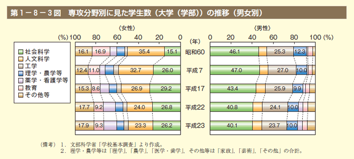 図表 > 第1部 > 第8章 > 第3図 専攻分野別に見た学生数(大学(学部))の推移(男女別)