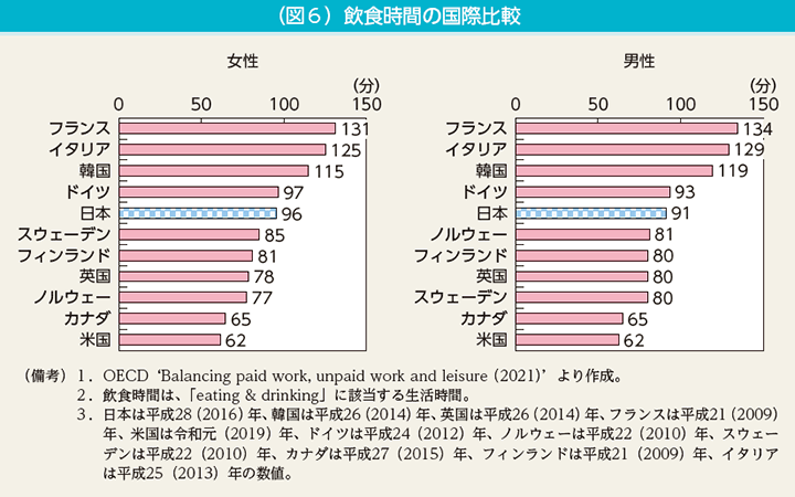続いて、労働時間以外の生活時間を見てみると、我が国は男女ともに睡眠時間が11か国中最も短く、労働時間が長い分、睡眠時間が短くなっていることが推察される。他方、男女ともに睡眠時間が最も長いのは、米国である(図5)。米国は、男女ともに労働時間も11か国中、最も長い一方、飲食に費やす時間が11か国中、最も短い。なお、男女ともに飲食に費やす時間が11か国中、最も長いのはフランス、2番目に長いのはイタリアであり、両国とも飲食に米国の2倍以上の時間をかけている(図6)。