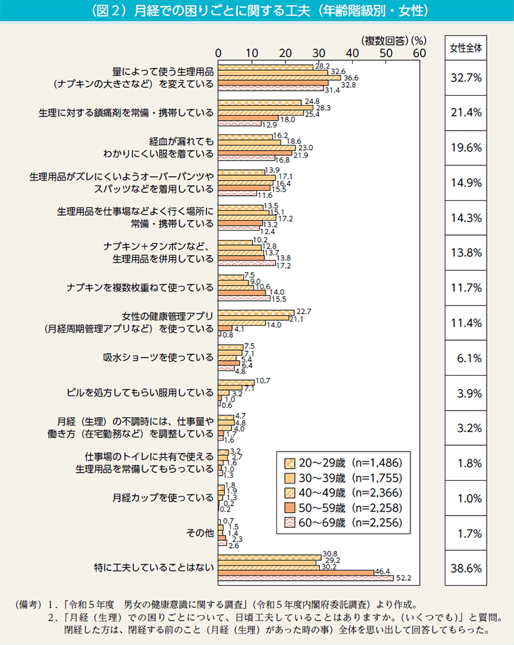 内閣府の調査によると、若い年代では月経への困りごとに対して、上の年代と比較してフェムテック・フェムケア製品を活用していることが分かった(図2)。管理職と更年期症状とがリンクする40代及び50代においては、更年期に関連する製品の充実及び活用が期待される。