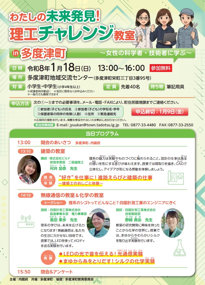 - わたしの未来発見!理工チャレンジ教室in多度津町~女性の科学者・技術者に学ぶ~