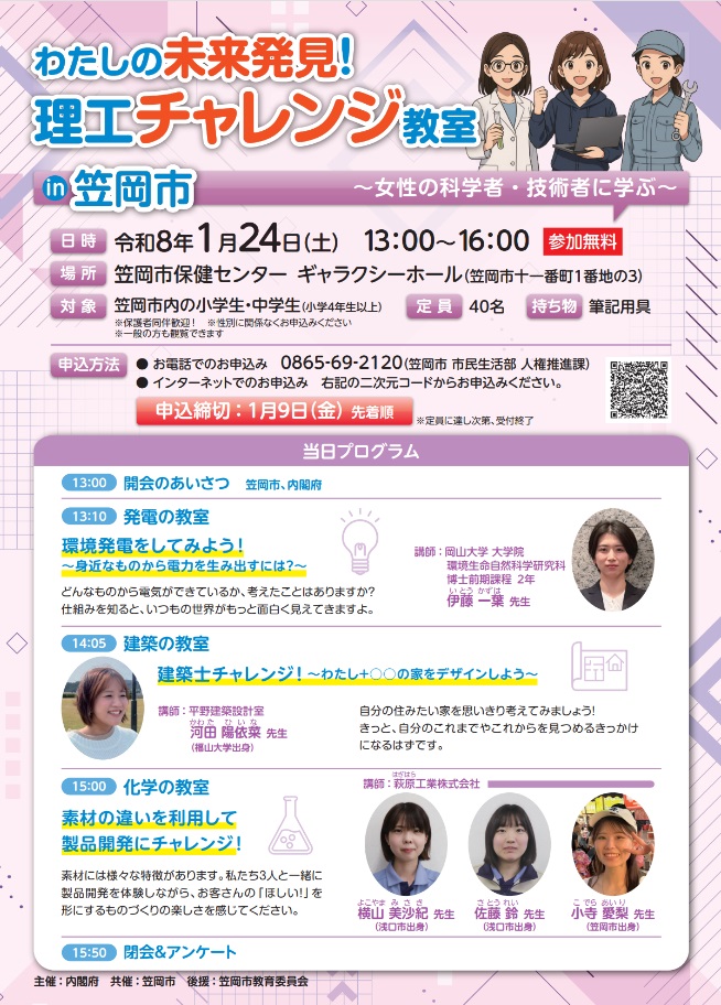 - わたしの未来発見!理工チャレンジ教室in笠岡市~女性の科学者・技術者に学ぶ~