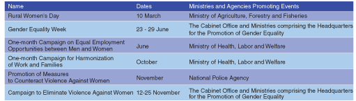 This table shows day, weeks and months specially designated by the Government of Japan to give a central focus to campaign designated to improve the status of women, promote equality and redress traditional gender-role concepts. National conference, symposia and other activities to promote understanding of Gender Equality are organized over these periods.