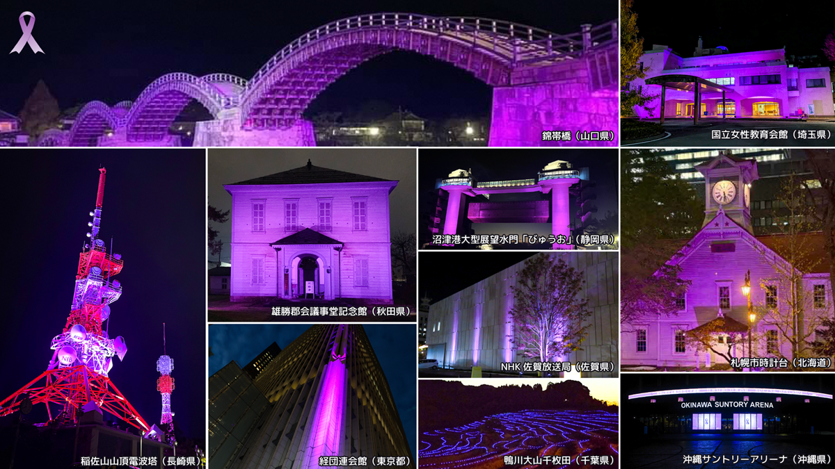 毎年、運動期間(11月12日~11月25日)を中心に、この趣旨にご賛同いただいた全国のタワーや商業施設、お城などで、パープル・ライトアップを実施していただいています。より多くの方にこのメッセージを届けられるよう、全都道府県でできるだけ多くのランドマーク等がライトアップされることを目指しています。