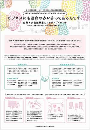 -ビジネスにも運命の赤い糸がある-。女性のエンパワーメント原則(WEPs)を軸に“女性起業家×取引機会を模索する大手・中堅企業の出会い”を創出。先進的な取引事例紹介に加え、女性起業家が意欲ある女子大生とともに「新事業の可能性」の提案や「商品サービス」の紹介を実施。取引先の開拓を行う企業担当者はもちろん一般の方も。ぜひご参加ください!