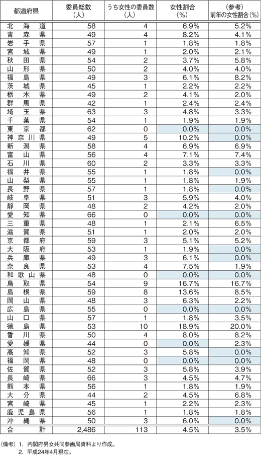 災害対策基本法に基づき、地方公共団体が設置する地方防災会議における女性委員の割合は、平成24年4月現在で、都道府県では4.5%(前年3.5%)となっています。前年の状況と比べると、女性委員がゼロの都道府県は、12都府県から6都県に減少しました(第8表)。