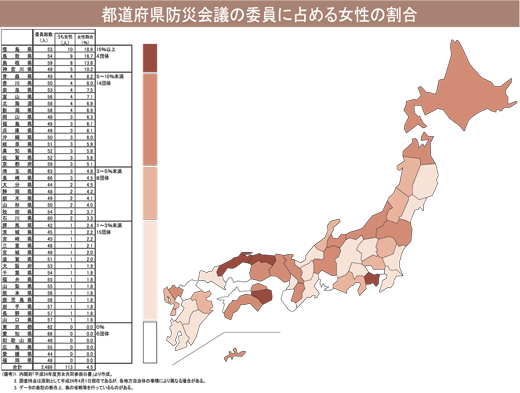 今年6月に平成24年版男女共同参画白書が公表されたことを踏まえ、7月に「都道府県防災会議の委員に占める女性の割合」を更新しました(下図参照)。前年と比べると、女性委員がゼロとなっている都道府県は、12都府県から6都県に減少しています。