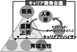 課長職への登用のためには、キャリア開発会議、部長層によるメンタリング、育成女性の課題に応じた研修を実施しています。また、部長級職への登用に向けた育成にも2008年から取り組んでいます。マネジメントやリーダーシップについての意識醸成を目的としたラウンドテーブルや、役員によるメンタリングを実施しています。その結果、部長級職に占める女性比率は2%から6.6%に増え、現在では開発・生産・購買・販売・間接部門など全部門に女性の部長層が在籍しています。