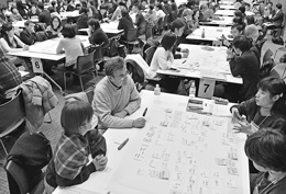 ワークショップは、松田氏の進行により、ワールドカフェ方式で行われ、自治体・企業・NPO等とさまざまな立場の参加者が、闊達で非常に熱気のあふれる雰囲気の中で、連携による子育て支援に関する検討テーマを設定し、意見を出し合い議論し、共有し合った。