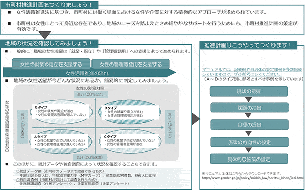 今後は、市町村推進計画策定支援マニュアル及び取組好事例集を広く展開し、女性の職業生活における活躍に向けた取組が全国津々浦々まで浸透していくことにつなげていきたいと考えています。
