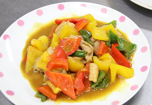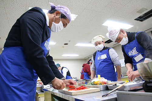 おとう飯サポーターに就任した田川市長が、今度は市内に居住又は勤務する20歳以上の男性と一緒に、福智町立金田中学校調理員の三浦俊祐さんを講師に迎え、料理教室を開催しました。田川市の特産品であるパプリカを使い、「パプリカと鶏肉のカレーマヨ炒め」、「パプリカの彩り和え」、「パプリカのワンタンスープ」の3品を作りました。