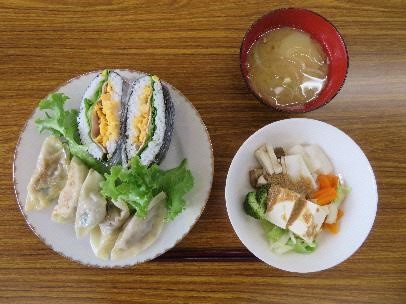 おにぎらず、きょうざ、温野菜の豆腐あえ、玉ねぎとジャガイモの味噌汁を作りました。参加者からは「指導方法がよかったので、うまくできました。」といった感想が寄せられました。